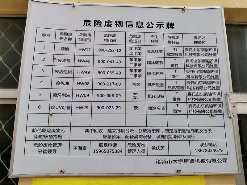 根据《中华人民共和国固体废物污染环境防治法》,产生、收集、贮存、运输、利用、处置固体废物的单位,应当依法及时公开固体废物污染环境防治信息,主动接受社会监督。先对诸城市大宇铸造机械有限公司危险废物污染环境防治信息进行公示: